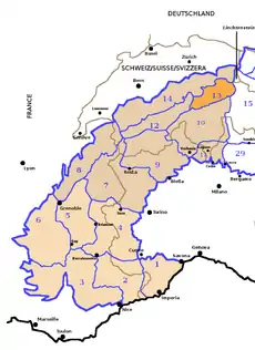 En detalle, y siguiendo el sentido de las agujas del reloj, los límites geográficos son: Paso del Oberalp, Andermatt, río Reuss, torrente Schächen, Ruosalper Grätli, Muotathal, Pragelpass, Lago de Klöntal, Netstal, río Linth, Lago de Walen, torrente Seez, Sargans-Sattel, río Rin, Coira, río Rin Anterior y Paso del Oberalp.