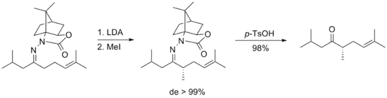 Ziegler y colaboradores hicieron reaccionar un yoduro de alilo con el azaenolato para generar una cadena de hidrocarburo quiral. Para evitar la pérdida de la pureza enantiomérica del producto, los autores utilizaron acetato cúprico para regenerar el grupo carbonilo, obteniendo solo un rendimiento moderado para la escisión del enlace C = N pero una buena enantioselectividad (ee = 89%). La cetona se transformó después de varios pasos en las denticulatinas A y B, metabolitos tipo polipropionato aislados de Siphonaria denticulata.[5]
