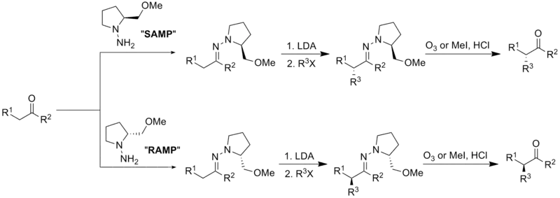 La reacción de alquilación de hidrazona SAMP / RAMP de Enders es una reacción asimétrica de formación de enlaces carbono-carbono facilitada por auxiliares quirales de pirrolidina. Fue iniciado por E. J. Corey y D. Enders en 1976.[1][2] Este método suele ser una secuencia de tres pasos. El primer paso es formar la hidrazona entre (S) -1-amino-2-metoximetilpirrolidina (SAMP) o (R) -1-amino-2-metoximetilpirrolidina (RAMP) y una cetona o aldehído. Posteriormente, la hidrazona se desprotona con diisopropilamida de litio (LDA) para formar un azaenolato, que reacciona con haluros de alquilo u otros electrófilos adecuados para dar especies de hidrazona alquilada con la generación simultánea de un nuevo centro quiral. Finalmente, la cetona o aldehído alquilado se puede regenerar por ozonólisis o hidrólisis.[3]