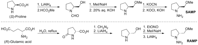 La combinación de derivados de aminoácidos cíclicos (SAMP y RAMP) y las poderosas técnicas de hidrazona fueron iniciadas por E. J. Corey y D. Enders en 1976, y posteriormente fueron desarrolladas de forma independiente por D. Enders. Tanto SAMP como RAMP se sintetizan a partir de aminoácidos. La síntesis detallada de estos dos auxiliares se muestra a continuación..[12][13]