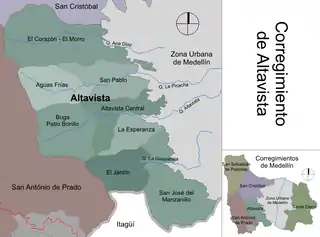 El corregimiento de Altavista agrupa bajo una sola unidad administrativa cuatro asentamientos rurales: Altavista, Aguas Frías, El Corazón y San José del Manzanillo, las cuales conforman las áreas urbanas del corregimiento.