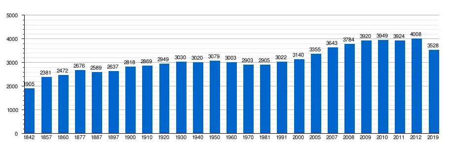 Evolución demográfica 1842 1857 1860 1877 1887 1897 1900 1910 1920 1930 1940 1950 1960 1970 1981 1991 2000 2005 2007 2008 2009 2010 2011 2012 2019 1905 2381 2472 2676 2589 2637 2818 2869 2949 3030 3020 3079 3003 2903 2905 3022 3140 3355 3643 3784 3920 3949 3924 4008 3528