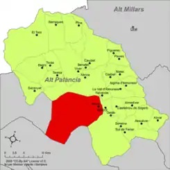 Jérica (Noroeste), Navajas (Norte) y Segorbe (Sureste) en la provincia de Castellón; Alcublas, Gátova, Marines y Liria en la provincia de Valencia
