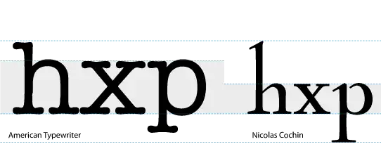 En este ejemplo vemos dos tipografías del mismo cuerpo, American Typewriter y Nicolas Cochin, con una altura de la x bastante diferente