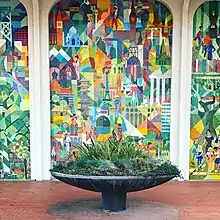 - Hay un mural mosaico de 1963 diseñado por Louis Macouillard y construido por Alfonso Pardiñas, que ilustra la vida de A.P. Giannini. Ubicado frente a un banco moderno de mediados del siglo (anteriormente una ubicación del Banco de Italia) en 300 S. El Camino Real en San Mateo, California.[17][18]