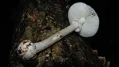 El estipe mide de 8,5 a 16 cm de largo por 0,9 a 1,6 cm de grosor, y es un poco más gruesa en la parte inferior que en la superior. Ella es "rellenada", con hifas blanquecinas semejantes al algodón. La superficie del tronco es lisa o tiene delicados mechones de pelos blancos y suaves, como la lana. Hay un bulbo arqueado en la base del estipe, que puede alcanzar un diámetro de más de 3 cm.[2] El anillo situado en la parte superior del tronco, a 1,2 a 1,7 cm de la parte superior es blanco, membranoso y de larga duración.[2] La volva permanece íntimamente unido a la bombilla, aunque una parte de ella pueda después estirar como una membrana delgada y adherirse a la base del tronco antes de colapsar. Cuando la seta se daña, la carne lentamente es de color marrón-rosado al marrón chocolate. Los ejemplares jóvenes no tienen ningún olor distinto, pero los cuerpos de fructificación más viejos pueden tener un olor que recuerda a la cebolla o al ajo.[2]
