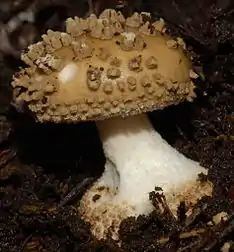 El píleo (sombrero) de A. australis tiene formato inicialmente convexo, pero con el pasar del tiempo tiende a quedar plano o desarrolla una depresión central. Llega a 20–90 mm de diámetro.[10] A veces, el margen del píleo está agrietado y se enrolla hacia atrás, dándole un aspecto rugoso. El centro del píleo es de color cuero oscuro, color miel o amarillo-blanquecino, con un tono más pálido cerca del margen. La superficie es pegajosa cuando la seta es joven o está mojado, pero cuando el hongo madura queda seco. Los restos de la volva forman verrugas cónicas a piramidales que están densamente agrupadas en el centro, llegando a ser escasas y más bajas hacia el margen. Inicialmente son blancas y luego sepia-grisáceas o amarillo-blanquecino, con puntas blancas o color piel.[1]