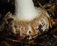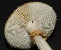 Las laminillas están atestadas, son blancas, están libres de adhesión al tronco y miden 6-10 mm de ancho. Los lamélulas (láminas cortas que no se extienden completamente desde el borde del píleo para el tronco) tienen extremidades truncadas. El estipe (tallo) mide 3,7 a 9,0 cm de altura y 0,6 a 2,6 cm de diámetro, siendo más cónico en el centro. Es hueco y tiene una base abruptamente bulbosa con un espesor entre 1,4 y 3,8 cm. La superficie del estipe por encima del nivel del anillo es blanca y está cubierta por mechones algodonosos de micelio; ya por debajo del anillo es blanco con surcos transversales castaños y grisáceos. La base puede o no puede tener un aro quebradizo de restos de la volva de color castaño amarillento a gris-sepia. El anillo es transparente, blanco a castaño amarillento, inicialmente colgado libremente y después adherido al tallo. La carne del píleo es blanca, ocasionalmente amarillo blanquecino pálido sobre el centro del píleo; ya la carne del tronco es toda blanca.[1]