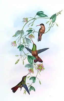 - Esta obra contiene una traducción derivada de «Buff-bellied Hummingbird» de Wikipedia en inglés, publicada por sus editores bajo la Licencia de documentación libre de GNU y la Licencia Creative Commons Atribución-CompartirIgual 3.0 Unported.