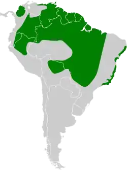 Se extiende por Colombia, Venezuela, Ecuador, Perú, Brasil, Paraguay, Bolivia, Surinam, Guyana, Guyana Francesa y Trinidad y Tobago. También se ha establecido como cimarrona en Miami, Florida. Su hábitat natural son las selvas tropicales y los límites de los forestales, aunque también en zonas abiertas con algunos árboles.