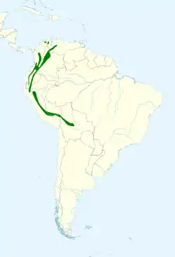 Se encuentra en las selvas húmedas tropicales y subtropicales de Bolivia, Colombia, Ecuador, Perú y Venezuela.[1]