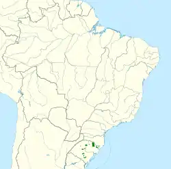 Habita el sur de Brasil (Rio Grande do Sul y sur de Santa Catarina). Vagante ocasional en Argentina (Misiones) y Paraguay.[2][5] Prefiere selvas templadas. En Argentina su situación es indefinida y delicada.