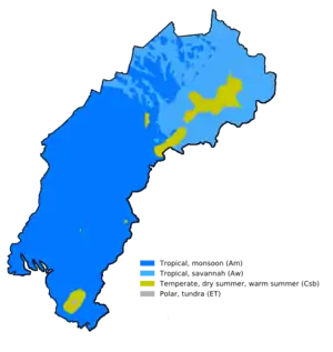 Dado que gran parte de Ambazonia se encuentra en el altiplano occidental, su clima es algo más fresco que el de las zonas circundantes de Camerún y Nigeria. Las tierras bajas a lo largo de la costa y los valles fluviales de Manyu, que forman parte de la depresión de Benue, son más cálidas. La mayor parte de Ambazonia tiene un clima tropical monzónico, con la llanura costera que contiene algunos de los lugares más lluviosos del mundo (como el pueblo de Debundscha). Las partes noreste de la Región Noroeste (incluyendo la ciudad de Bamenda) tienen un clima de sabana tropical, con distintas estaciones húmedas y secas. A mayores altitudes, como el macizo Oku y el monte Camerún, hay zonas donde las temperaturas descienden lo suficiente como para ser clasificadas como un clima mediterráneo de verano cálido. La cima del monte Camerún tiene un clima polar de la variante de la tundra, único en África Occidental y extremadamente raro tan cerca del Ecuador.[59]