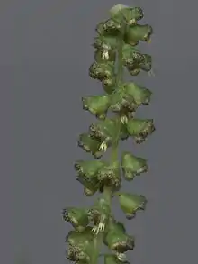 Es una hierba que alcanza un tamaño de 50 a 80 cm de altura, cuyas ramas tienen pelillos. Las hojas están divididas con pequeños picos y están aterciopelados. Las flores son verde-amarillentas, forman agrupaciones en las partes terminales de las plantas, en forma de largas espigas.