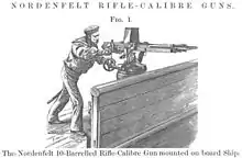 La ametralladora Nordenfelt era un arma multi-cañón que dependiendo del modelo y calibre tenía una hilera de dos a doce cañones. Era disparada con el movimiento una palanca hacia atrás y adelante. Fue producida en diversos calibres, desde los empleados en fusiles hasta 25,4 mm (1 pulgada). También fueron empleados calibres mayores, pero para estos el diseño del arma permitía una recarga manual rápida en lugar de fuego automático.