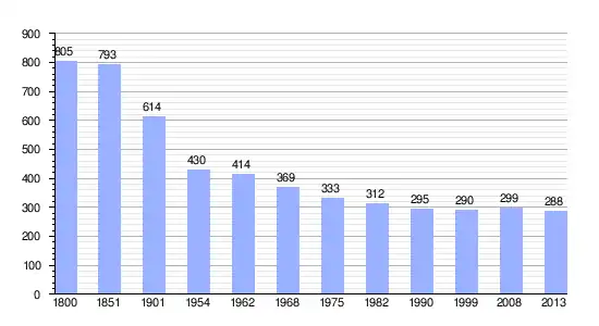 Los datos demográficos contemplados en este gráfico de la comuna de Amfreville[5] se han cogido de 1800 a 1999 de la página francesa EHESS/Cassini, y los demás datos de la página del INSEE.[6]