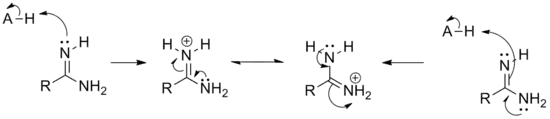 La protonación ocurre sobre el nitrógeno hibridado sp². Esto ocurre porque la carga positiva se puede deslocalizar en ambos átomos de nitrógeno. La especie catiónica resultante es conocida como un ion amidinium [3] y posee longitudes de enlace C-N idénticas.