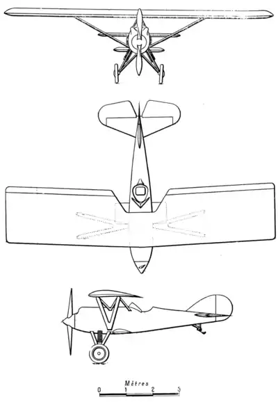 Era un monoplano de ala en parasol arriostrada por soportes, con una estructura completamente metálica y fuselaje de recubrimiento metálico. El primer prototipo tenía un ala recubierta de tela, reemplazada por un recubrimiento metálico en el segundo, arriostrada a cada lado por un par de puntales en forma de V. Tenía un tren de aterrizaje fijo convencional y estaba amortiguado por la interposición de bloques de goma. En la base de los soportes, un ala embrionaria proporcionaba sustentación adicional y, sobre todo, servía como depósito de combustible lanzable en vuelo.[1][2] El conjunto se calculó con un coeficiente de seguridad de 18.