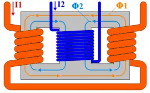 Se utilizan dos núcleos magnéticos para evitar que la corriente alterna genere una corriente de alto voltaje en los devanados de control. Al conectarlos en la fase opuesta, los dos se cancelan entre sí, de modo que no se induce corriente en el circuito de control.