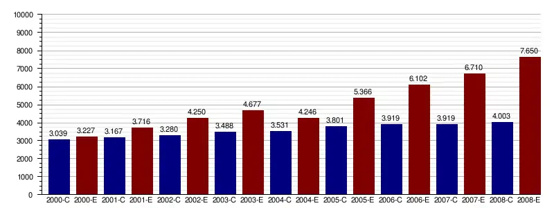 Evolución demográfica de los núcleos de Castellón de Ampurias (C) y Ampuriabrava (E) |