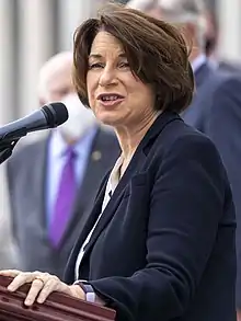 Amy Jean Klobuchar (Plymouth, Minnesota; 25 de mayo de 1960) es una abogada y política estadounidense que se desempeña como senadora de los Estados Unidos por Minnesota desde 2007. Miembro del Partido Demócrata-Agrario-Laborista de Minnesota, afiliada del Partido Demócrata de Minnesota, previamente se desempeñó como fiscal del condado de Hennepin. Anunció su candidatura para la nominación demócrata a la presidencia de los Estados Unidos en las elecciones de 2020 el 10 de febrero de 2019; el 2 de marzo de 2020, suspendió su campaña y respaldó a Joe Biden.[1][2]