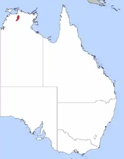 Se encuentra únicamente en el norte del Territorio del Norte. Su hábitat natural son los herbazales tropicales y las zonas rocosas. Está amenazado por la pérdida de hábitat.