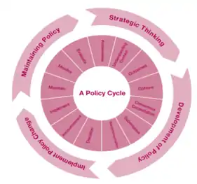 Una forma de hacerlo sigue un modelo heurístico llamado ciclo de políticas . En su forma más simple, el ciclo de políticas, que a menudo se representa visualmente como un bucle o círculo, comienza con la identificación del problema, continúa con un examen de las diferentes herramientas de políticas que podrían usarse para responder a ese problema, y luego continúa a la etapa de implementación, en la que una o más políticas se ponen en práctica (por ejemplo, se establece una nueva regulación o subvención). Finalmente, una vez que se ha implementado y ejecutado durante un período determinado, la política se evalúa. Se pueden utilizar varios puntos de vista diferentes durante la evaluación, incluida la observación de la efectividad, rentabilidad, relación costo-beneficio, resultados o productos de una política.
