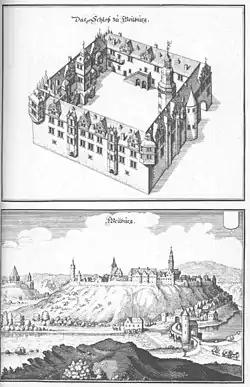 Dillenburg en 1575, mostrando el antiguo castillo en los alto de la colina y la iglesia de San Juan debajo.