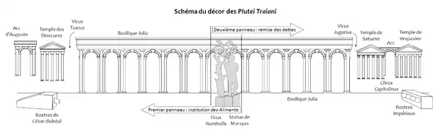 Están decoradas con dos escenas distintas, que hacen referencia a eventos históricos que tuvieron lugar en el reinado de Trajano, a menos que la segunda escena represente más bien acontecimientos al principio del de Adriano, a quien los arqueólogos recientemente atribuyen la reallización de los relieves[1]. Las dos escenas se desarrollan en el Foro cuyos monumentos se encuentran representados en el fondo. En cada escena en el primer plano de un extremo, se destaca la presencia de la estatua de Marsias[6].