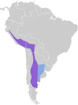 Esta especie se distribuye desde el centro de la Patagonia de la Argentina por el sur, siguiendo por el oeste de Bolivia, hasta gran parte del Perú, y el extremo norte de Chile.[3] En invierno la población austral migra al norte. Habita en arbustales de terrenos abiertos o bordes de bosques xerófilos, generalmente áridos o semiáridos.