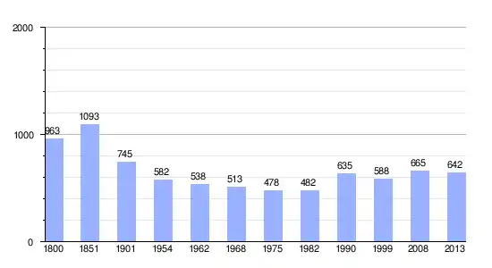 Gráfica de evolución demográfica de Ance-Féas entre 1800 y 2013 |