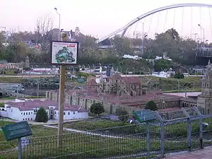 A la memoria de Ignacio Aguilar García:Este parque de miniaturas fue diseñado para el Pabellón de Andalucía en Expo 92 por Ignacio Aguilar García (Marchena, 1938 - Tomares, 1997), arquitecto, acuarelista, químico y escenógrafo. Mas, sobre todas las cosas, enamorado conocedor de Andalucía. Llevado en su espíritu juvenil y siempre alegre, fue su idea "enseñar jugando la región", y por eso, durante la muestra universal, se llamó a este recinto "Andalucía de los niños". Su éxito fue extraordinario, recibió más de un millón de visitas y fue calificado por la prensa como "una de las siete maravillas de la Expo". Hoy es la única atracción de la Isla de la Cartuja que se mantiene en la misma actividad para la que fue concebida. Sirva este azulejo como homenaje al talento y a la alegría que Ignacio Aguilar derrochó entre todos quienes tuvieron la suerte de conocerle y quererle, y a la Junta de Andalucía y a la ciudad de Sevilla, que han sabido mantener este legado extraordinario.