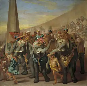 También con atribución a Castiglione ingresó en el Museo del Prado Elefantes en un circo, una de las pinturas de la historia de Roma antigua que hacia 1634 contrató el virrey de Nápoles conde de Monterrey con diversos artistas napolitanos, entre ellos Aniello Falcone, con destino a la decoración del nuevo Palacio del Buen Retiro en Madrid.[2] El cuadro, ahora considerado obra de Andrea di Lione, se inscribe en una serie de dieciséis pinturas (de las que se conservan catorce) dedicadas a las diversiones públicas o pompa circensis, a la que pertenecen también las dos obras con las que su maestro contribuyó al extenso encargo: Soldados romanos en el circo y Atletas romanos, ambas en el Prado.[3]