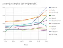 Las aerolíneas más grandes del mundo pueden ser clasificadas de diversas formas. American Airlines Group es la mayor por tamaño de flota, ingresos, beneficios, pasajeros transportados y pasajeros-milla. Delta Air Lines es la mayor por valor de activos y capitalización bursátil. Lufthansa es la mayor por número de empleados, FedEx por tonelada-kilómetro, Ryanair por número de pasajeros internacionales transportados y Turkish Airlines por número de países en los que opera.