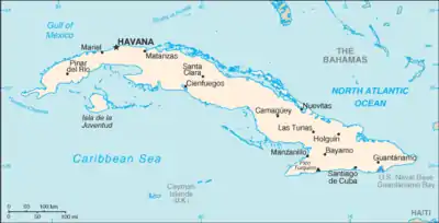 Cuba, officialmente la República de Cuba, es un archipiélago de islas localizadas al norte del Mar Caribe en la confluencia del Golfo de México y el Océano Atlántico. Los Estados Unidos se ubican al noroeste, las Bahamas al norte, Haití al este, Jamaica y las Islas Cayman al sur, y México al oeste. El país se subdivide en 15 provincias y un municipio especial (Isla de la Juventud, la segunda isla más grande del país). La capital de Cuba y ciudad más grande es La Habana.