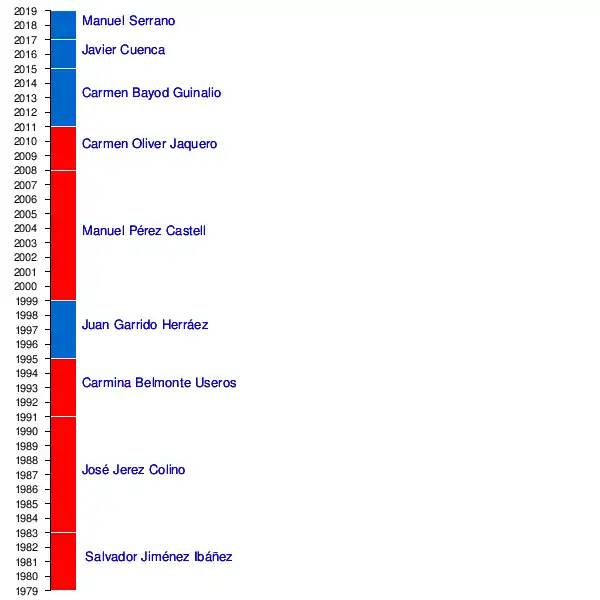 15 de junio de 2019 | Vicente Casañ | Ciudadanos. Es investido alcalde gracias a un pacto de gobernabilidad con el PSOE, repartiéndose la alcaldía dos años cada uno.[4] |