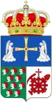Escudo medio partido y cortado. Primer cuartel partido, tres flores de lis en oro. Segundo cuartel partido, cuervo en sable. Tercer cuartel cortado, sobre ondas tres ánades. Al timbre corona real cerrada.[20] |