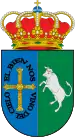 Escudo cortado y medio partido. Primer cuartel: la Cruz de los Ángeles en oro y piedras preciosas, acompañado de dos ángeles arrodillados. Este es el emblema del Arzobispado de Oviedo al que perteneció el concejo. Segundo cuartel partido: diez yelmos de plata.Tercer cuartel, pico y pala puesto en aspa cargado de una rueda dentada, el todo surmontado de la Cruz de la Victoria. [30] |