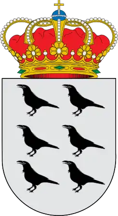 En campo de plata, seis cuervos, de sable, puestos en dos palos. |