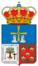 Cuartelado. Primer cuartel: la Cruz de los Ángeles en oro y piedras preciosas, acompañado de dos ángeles arrodillados vestidos de blanco. Segundo cuartel: en gules una torre almenada con un águila naciente sobre ella, y sobre el águila un cuerno que es el cuerno de la abundancia, a los dos laterales de la torre dos palmas. Tercer cuartel: un hombre cocinando con una caldera sujeta al tronco de un árbol. Cuarto cuartel: una torre almenada con un león alzado hacia sus almenas, sobre la torre un cáliz y sobre todo ello una Hostia. Al timbre corona real del Príncipe de Asturias.[28] |