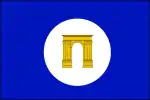 Bandera de proporciones 2:3, dividida verticalmente en dos partes, la primera, negra, de anchura 1/4 de la largura de la bandera, la segunda, amarilla, con dos hojas de laurel verdes de altura 7/18 de la del paño, situadas, la primera en el lado superior del palo, y la segunda en el lado inferior del vuelo.[69] |