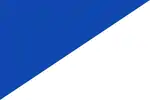 Bandera de proporciones 2:3, bicolor horizontal, azul y blanca, con el primer tercio vertical negro.[19] |