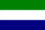 Bandera de proporciones 2:3, verde arriba y azul claro abajo, con una faja amarilla de grueso 1/6 de la altura del paño, entre el verde y el azul.[31] |