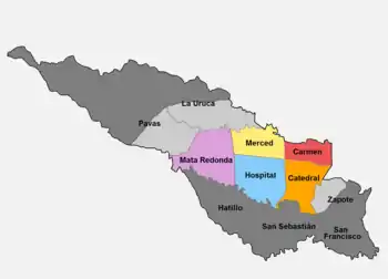 ![]() | Almendrares, Ángeles, Cuba, Bolívar, Carit, Corazón de Jesús, Cristo Rey, Merced, Pinos, Salubridad, San Bosco, San Francisco, Santa Lucía y Silos. Así como parte de los barrios de: Colón, La Dolorosa y Pacífico. | ![]() | |