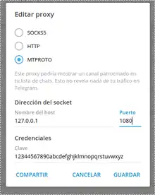 Tras el bloqueo en Rusia, se desarrolló desde 2018 la funcionalidad MTProto Proxy sin anunciarlo de forma oficial a la prensa.[70] A diferencia de los tradicionales VPN el servicio propio ofrece la creación de servidores proxy exclusivos para Telegram, con estadísticas del servicio y la posibilidad de añadir un canal patrocinador para monetización.[71][72] Para usar los servidores exclusivos es necesario añadir sus credenciales y activarlos desde los ajustes proxy de los clientes móviles y de escritorio (versión 1.3).[70][73] El funcionamiento difiere de otras más estandarizadas como SOCKS y viene incluido en los clientes oficiales.[74][75]