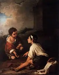 Este de Viena es uno de los dos cuadros que se conservan de Murillo en los que se representa a niños jugando a los dados, el otro está en Múnich.[42] En el sucinto bodegón que el pintor sitúa abajo, en primer plano, vemos dentro del cesto de mimbre, ya casi fuera del lienzo, lo que parece ser una jarra de "blanco Triana", en la que se adivina el motivo vegetal que la decora.