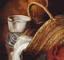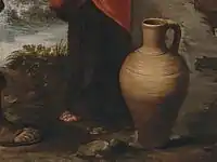 Abajo, a la izquierda, apoyada en la vieja cesta de mimbre, una cantarilla pequeña con la boca rota. No es la primera vez que Murillo confirma la validez y la dignidad de una pieza alfarera aunque esté desportillada; también en Curación del paralítico en la piscina probática había pintado un pucherito con el labio roto. El mensaje -incomprensible en el siglo XXI- está claro: "todavía sirve".[44]