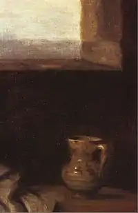 En el ángulo inferior izquierdo, presidiendo un humilde bodegón, vemos una cántara ovoide, panzuda, con una sola asa, hecha probablemente en algún taller de Triana,[6] o traída de los alfares del Aljarafe, de la tierra llana de Huelva o incluso de Lebrija, focos productores de los típicos cántaros sogelaos,[7] muy comunes en todo el bajo Guadalquivir: Beas, Trigueros, y Villarrasa. Este modelo que aparece en el Niño espulgándose (quizá el mismo cántaro, parte del ajuar doméstico de la casa familiar del pintor), vuelve a ser pintado en varias ocasiones, como puede verse a lo largo de esta Galería. Se trata de una pieza muy similar a la que, el también sevillano Velázquez, había pintado treinta años antes en El aguador de Sevilla, estudiada por Natacha Seseña.[8]