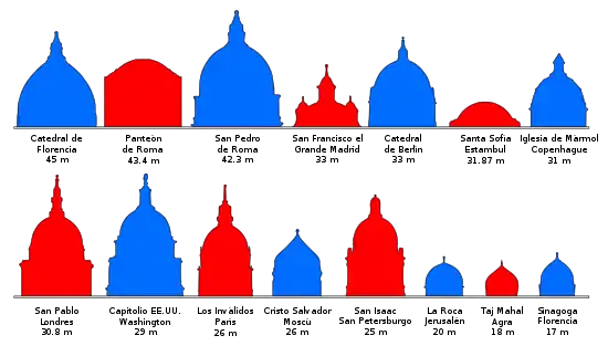 ![]() | ![]() | 42,3[3] | Basilica de San Pedro | Roma | ![]() | 1549-1593 | Arquitecto: Michelangelo Buonarroti. Con 136,57 m, el domo más alto del mundo hasta 1990 y el interior del domo más alto (incluida la linterna) en la actualidad; cúpula de dos capas. | — | E | |