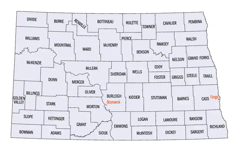 El estado de Dakota del Norte, en Estados Unidos, se divide en 53 condados (counties).